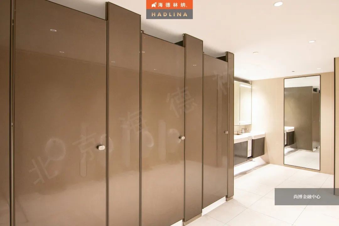 尚博金融中心采用海德林納?天地式衛生間隔斷系統,封閉式空間保護隱私。在設計上,隔斷正面鑲嵌玻璃作點綴,使衛生空間整體通透,在視覺上有很強的延伸感,給人低調奢華的感受。