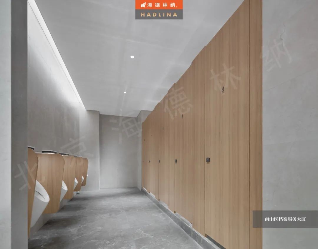 深圳檔案大廈衛生間隔斷系統選用的是海德林納?HD-5款式,其獨特的原木色花紋,猶如一幅自然之美的畫卷,與空間相得益彰,為使用者帶來舒適和美好。26mm的厚度,以精湛工藝打造,展現出別具匠心的設計。獨特的材質賦予門體優異的防撞擊性能,而且具有優異的耐腐蝕特性,能延長使用壽命,確保其長久美觀。同時,此隔斷為國家A級防火,能有效隔絕火源,保護整個空間的安全。