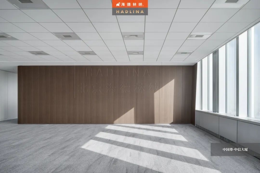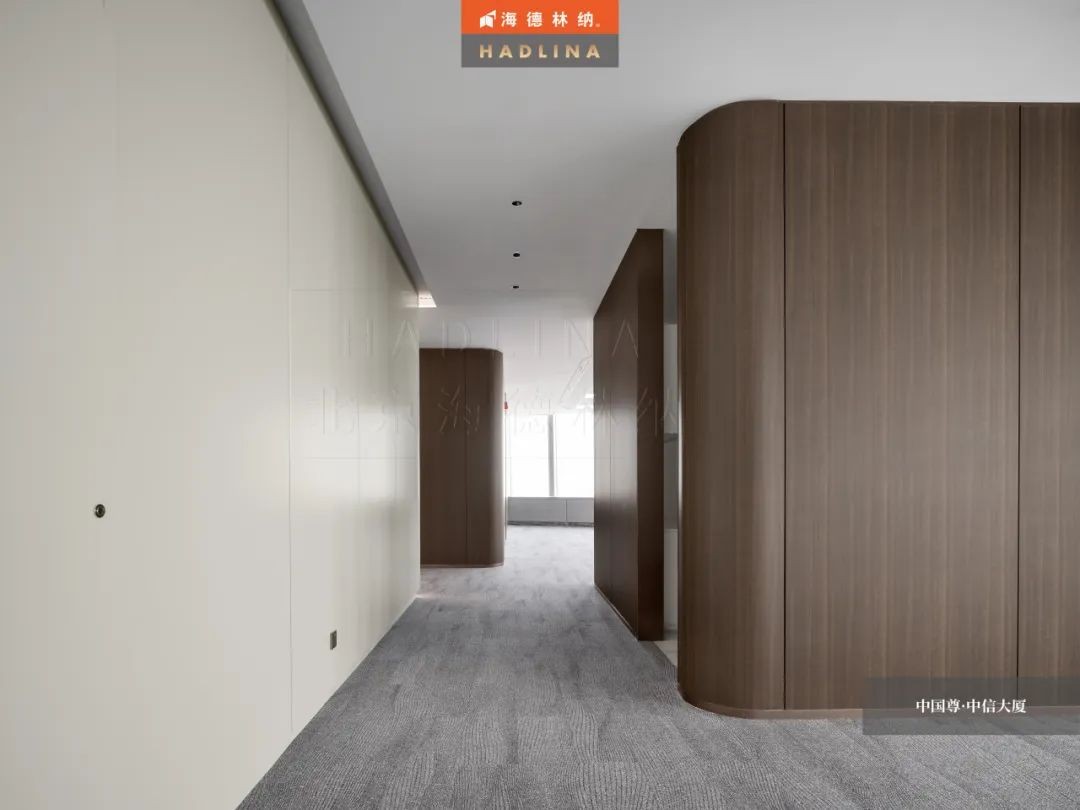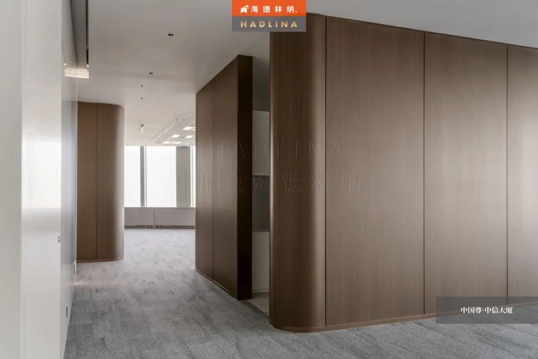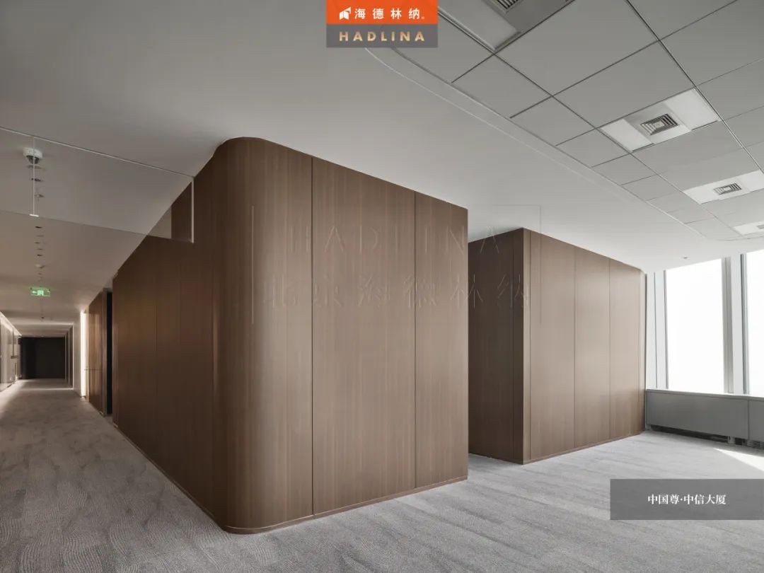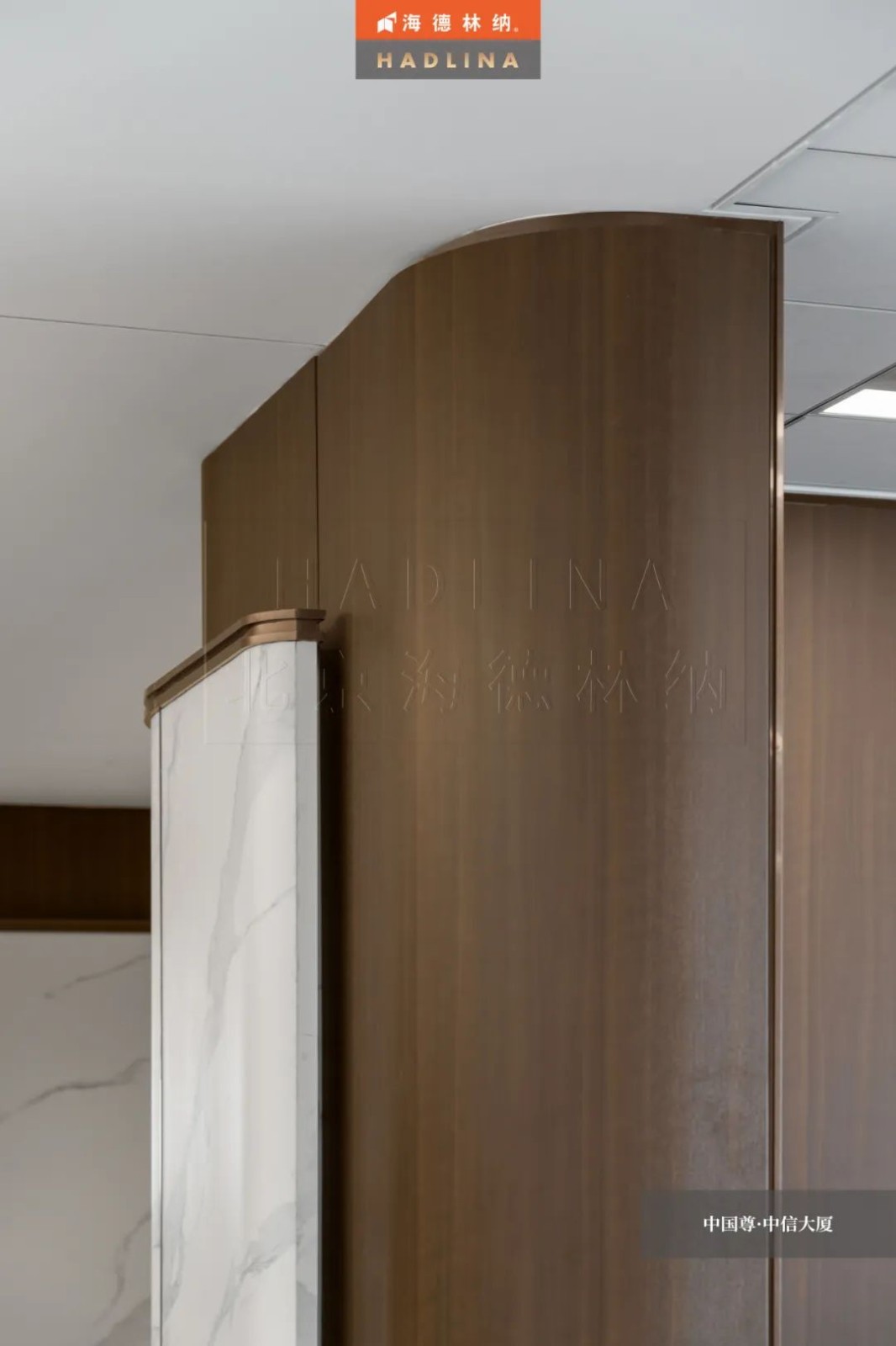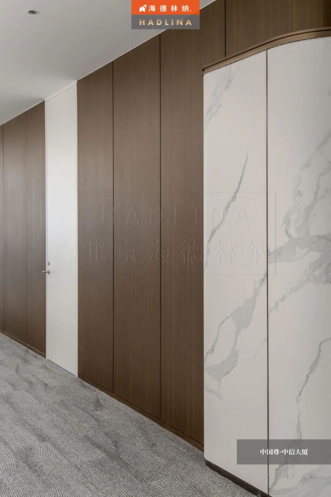 中國尊/中信大廈裝配式掛墻系統主要選用海德林納?木紋/布紋為主要顏色,將色彩與空間完美結合,給人帶來一種溫暖、自然的感受。色彩的選擇與搭配讓整個空間更加和諧統一,營造出舒適宜人的氛圍。為人們提供了愉悅的視覺享受,讓人沉浸在自然的溫暖與寧靜之中。