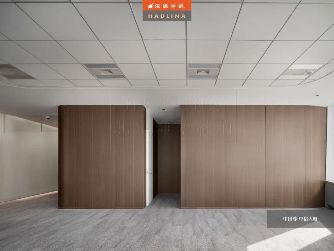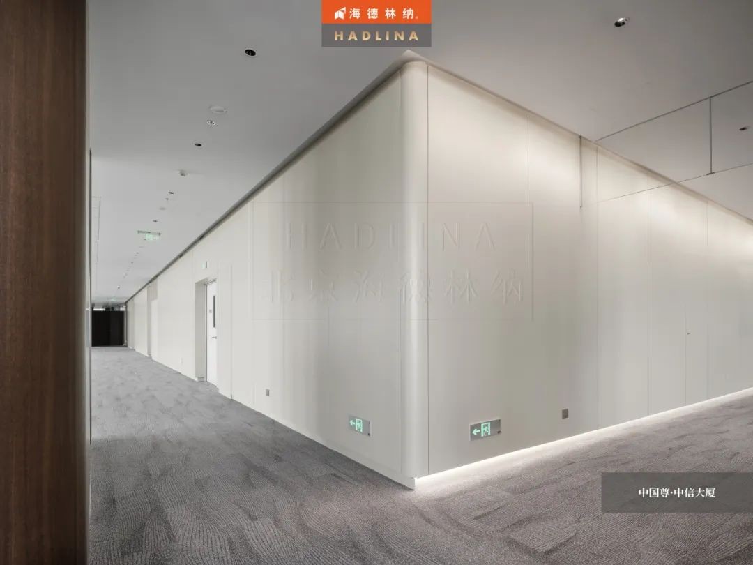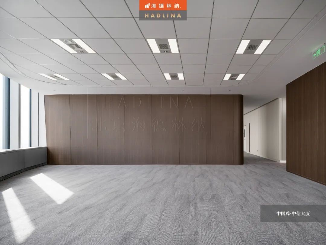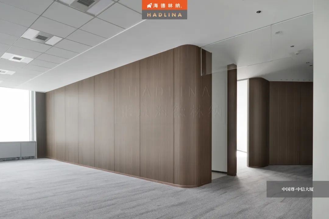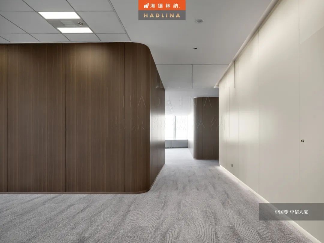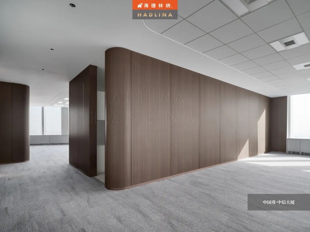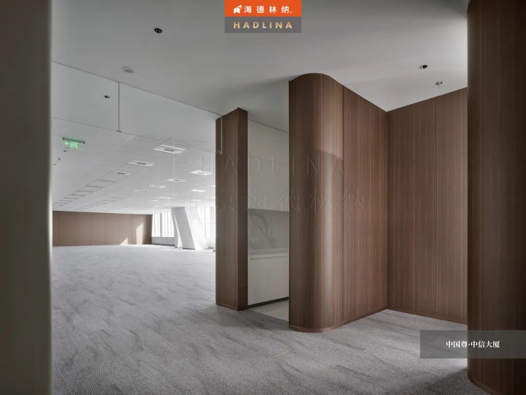 中國尊/中信大廈裝配式掛墻系統主要選用海德林納?木紋/布紋為主要顏色,將色彩與空間完美結合,給人帶來一種溫暖、自然的感受。色彩的選擇與搭配讓整個空間更加和諧統一,營造出舒適宜人的氛圍。為人們提供了愉悅的視覺享受,讓人沉浸在自然的溫暖與寧靜之中。